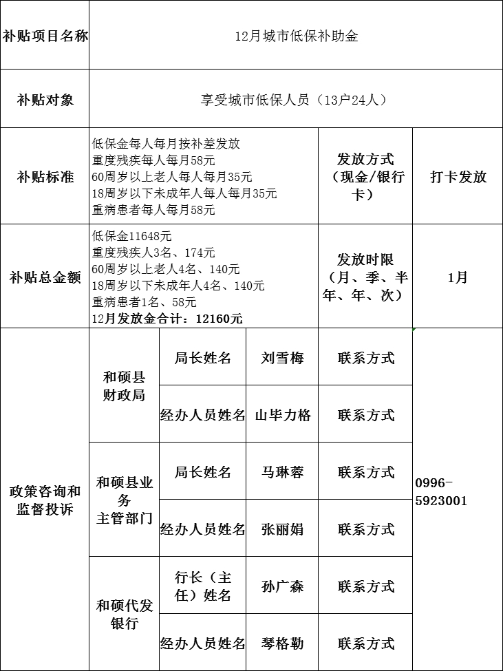 和硕县新塔热乡2025年12月城市低保补贴公示表