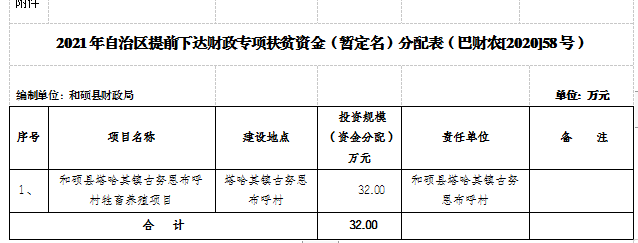 2020年,上级下达和硕县2021年自治区提前告知财政专项扶贫资金(巴财农[2020]58号)32万元,按照县扶贫领导小组关于《关于对和硕县2021年度自治区提前下达财政专项扶贫资金(扶贫发展)项目的批复》(硕扶领字[2021]1号),现将有关资金安排情况公示如下: