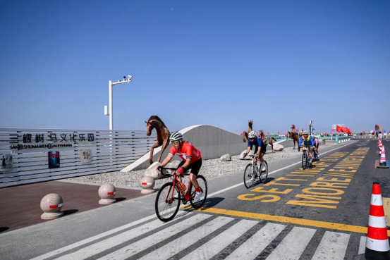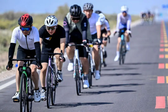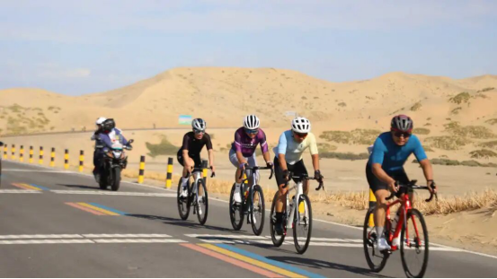车轮滚滚向前,一边是博斯腾湖碧波万顷,清风拂过,湖面泛起粼粼波光,水鸟不时掠翅而过,勾勒出一幅灵动的生态画卷;另一边,浩瀚沙漠与红柳滩错落有致,红柳花海绚烂多彩,博斯腾湖如宝石般的蓝色、沙漠的金黄色相互碰撞,宛如闯入一幅不断流动的湖光山色图。对于参赛骑手而言,骑行在这里,不再仅仅是一项运动,更成为了一场与大自然亲密对话的惬意之旅。