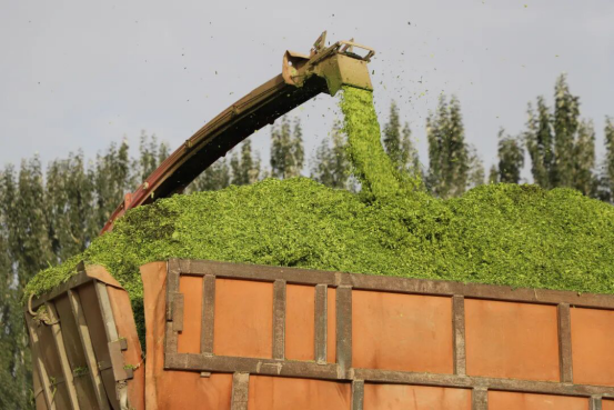 10月10日,在新疆清源农业发展有限公司二基地职工阿迪江·阿卜力孜的30亩复播青贮玉米田里,秋日暖阳洒在翠绿的玉米植株上。伴随着阵阵轰鸣声,大型收割机缓缓驶入田间,锋利的刀片高速旋转,将青贮玉米整齐割断,随即卷入机身进行粉碎处理,粉碎后的青贮玉米被源源不断地装入运输车辆,丰收图景尽现眼前。