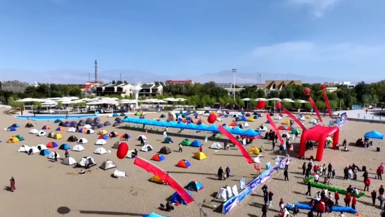 国庆期间,全国最大内陆淡水湖——博斯腾湖之畔的和硕金沙滩旅游度假区成为欢乐海洋。10月3日,2025年“新疆是个好地方•第二届金沙滩沙漠露营大会暨首届‘援疆杯’金沙滩沙漠体育大会”盛大启幕。以“2025新疆是个好地方•金沙滩双会共耀,千人健身嗨翻十一”为主题,吸引全疆各地650名户外运动爱好者纷至沓来,在大漠与碧水间畅享运动与自然交融之美。活动现场,金色沙滩上帐篷如繁星点缀,健康跑、沙漠拔河、沙漠龙舟、飞盘比赛等十余项群众性体育活动轮番上阵,欢呼声、加油声此起彼伏,构成一幅生动和谐的活力图景。“活动丰富有趣,孩子玩得尽兴,主办方还贴心准备了设施装备,金沙滩的美景更是让人陶醉,不虚此行!”来自外地的游客张强赞叹道。