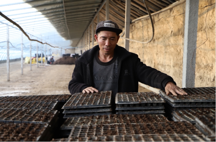 和硕县清源农业发展有限公司种植户杨泽军说:“今年我承包了九座大棚,其中计划培育八座棚的辣椒苗,一个棚的西瓜苗,从前天开始装营养土,已经装了两个棚了,还剩七个棚。装完营养土以后,前期准备工作就基本做完了,大概1月18号就可以点种育苗了。”