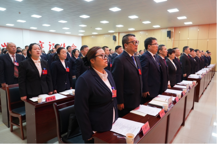 会场内气氛庄重热烈,主席台帷幕正中的国徽在鲜艳的红旗映衬下熠熠生辉。会议在雄壮的国歌声中开幕。
