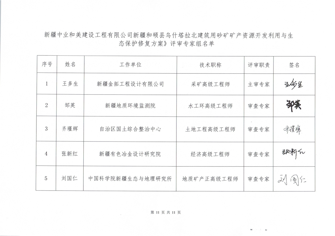《新疆中业和美建设工程有限公司新疆和硕县乌什塔拉北建筑用砂矿矿产资源开发利用与生^态保护修复方案》评审专家组名单