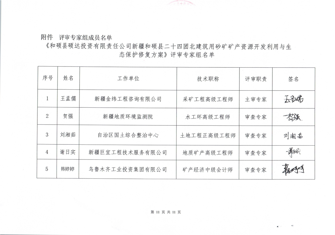 新疆中业和美建设工程有限公司新疆和硕县乌什塔拉北建筑用砂矿矿产资源开发利用与生^态保护修复方案》评审专家组成员名单