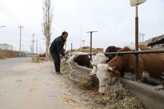 和硕县新塔热乡新塔热村养殖户邓尚春说:“我们主要是喂了些麦秸秆、苞谷秸秆,还有一些苞谷面,就是调理肠胃的饲料。这样喂出来的牛比较健康,那牛长势也好,抵抗力也强,冬天不怕冻,也不生病。身体健康了,收成也就好了。”