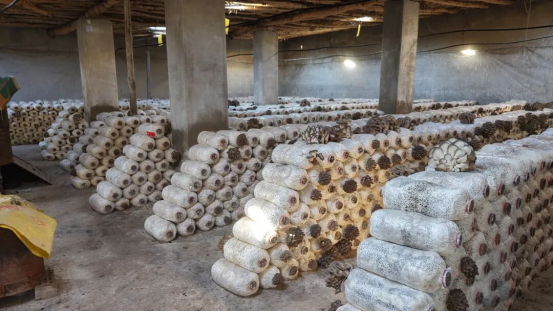 和硕县苏哈特乡苏哈特村蘑菇种植户田桂礼说:“我在院子里面建了三座大棚,面积在1500平方左右,今年我种植平菇菌棒5万(个)以上,年产量在35吨左右,现在每天销售120到150公斤,收入还算可以。”
