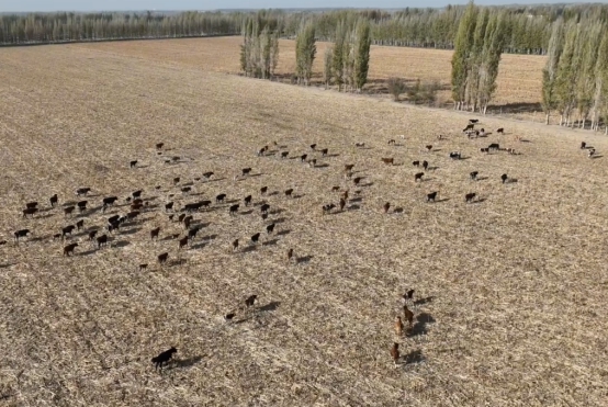 随着冬季来临,在和硕县,牧民纷纷将牛羊从山区赶往较为温暖的冬季草场或农区秸秆地里过冬。不同于以往依赖圈舍饲喂,这种将越冬牲畜“餐桌”搬进农区秸秆地“租田借牧”的创新模式,既为牧民省下了高额饲喂成本,又让农户的秸秆地“变废为宝”,成为当地秋冬季节农牧产业融合的生动实践。