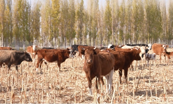 “乌什塔拉乡大湾村拥有11900亩集体土地,今年种植了5000余亩玉米。秋收过后,这些承载着秸秆的田地变成‘冬季牧场’,以每亩200元的价格出租给养殖户。玉米种植每亩能收900元承包费,秋后出租秸秆地又能多赚200元,一亩地两份收入。同时,作为畜牧大村,村里共有2000多头牛,农户的秸秆地刚好满足本地养殖户的需求。更划算的是,牛羊粪便自然还田,能提升土地肥力,为来年种植打下好基础。”乌什塔拉乡大湾村村委会副主任何刚说道。
