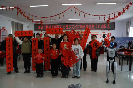 活动现场,各族群众欢聚一堂,感受科学魅力与传统风情碰撞交融。村文艺小分队婉转的歌声、欢快的舞步点燃现场氛围。书法爱好者挥毫泼墨,一副副寓意吉祥的春联、一个个饱含祝福的福字,为村民送上新春美好期许。孩子们翻飞巧手剪纸,将“民族团结一家亲”的美好愿景融入指尖作品。妙趣横生的科普谜语有奖问答、灵动可爱的机器人与机器狗互动体验,吸引大人孩子踊跃参与,大家在轻松愉悦的互动中学习科普知识、拉近邻里距离。