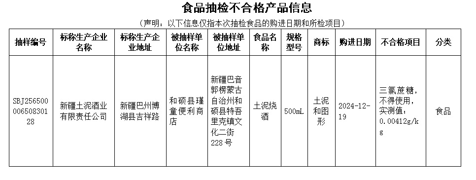 2025年12月30日,和硕县市场监督管理局接到国家食品安全抽样检验信息系统中登记的核查处置任务,显示新疆维吾尔自治区市场监督管理局委托重庆市计量质量检测研究院在2025年12月18日对和硕县瑾童便利商店经营的新疆土泥酒业有限责任公司生产的“土泥烧酒”(生产日期:2021年11月21日,净含量:500ml、酒精度:50%vol)进行抽样检验。重庆市计量质量检测研究院于2025年12月30日出具编号为:№: 2025-03AP120496的检验报告,经抽样检验,三氯蔗糖项目不符合 GB 2760-2014《食品安全国家标准 食品添加剂使用标准》要求,检验结论为不合格。2025年12月31日,我局执法人员依法向当事人送达了“土泥烧酒”的《检验报告》。