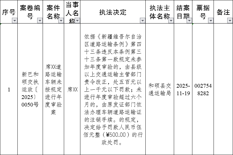 巴州交通运输行政处罚案卷登记台账(和硕县交通运输局)(2025年11月第三周)