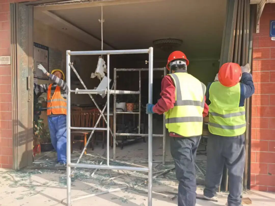 此次改造并非简单“表面翻新”,而是精准破解老旧街区痛点。外观提升上,施工团队摒弃“一刀切”,结合街区特色选用协调配色,对商铺外立面精细化粉刷,彻底消除墙面斑驳、污渍堆积问题,三条街道视觉形象大幅提升。针对商铺门窗老化、密封差等问题,免费为商户更换新型节能门窗及优质商铺门,新门窗既提升保温隔热效果、降低能耗,又增强安全防护,从根本上改善经营条件。工程推进中,项目团队严控质量,全程监督原材料与施工工艺,同时科学安排工期,避开人流、车流高峰,设置临时疏导标识,最大程度减少对居民生活与商户经营的干扰。