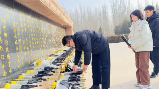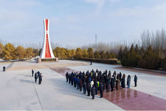 当日,马兰革命烈士陵园苍松肃立,氛围庄重。花岗岩铸就的马兰革命烈士纪念碑静静矗立,无声诉说着先辈们铸就大国核盾牌的功勋。活动伊始,主持人以沉痛语调回溯88年前南京城的浩劫与67年前马兰先辈的戈壁坚守,向民族英烈与马兰忠魂致以崇高敬意。全体人员肃立奏唱国歌,在激昂旋律中凝聚民族共识;脱帽向烈士行三鞠躬礼,依次手持白菊敬献至纪念碑前,瞻仰英烈丰碑,既铭记南京之殇,也读懂了马兰精神的分量。