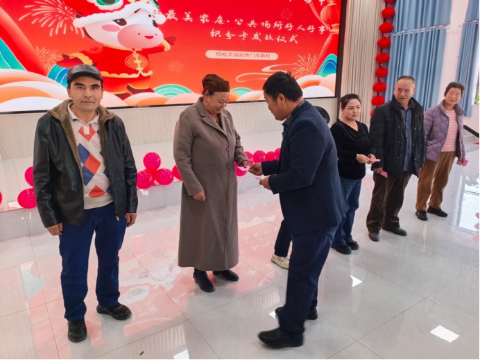 伴随着欢快激昂的旋律,晚会在舞蹈《开门红》中正式拉开帷幕,灵动的舞姿、喜庆的服饰瞬间点燃了现场群众的热情,掌声、欢呼声此起彼伏。村民自编自演的舞蹈《爷爷奶奶和我们》《江湖夜雨十年灯》,舞姿质朴自然、情感真挚动人,满满都是乡土气息与烟火温情;县教科局干部职工带来的表演《花轿迎新奋勇向前》创意新颖、诙谐生动,大合唱《拜新年》气势昂扬、暖意融融,既展现了教科系统干部职工的良好精神素养,也传递出后盾单位与村民同心同行、共迎新春、共话发展的真挚心愿。活动现场,还专门为“美丽庭院”“好人好事”先进代表颁发积分卡,以榜样引领文明新风,推动文明理念深度融入基层治理各环节。