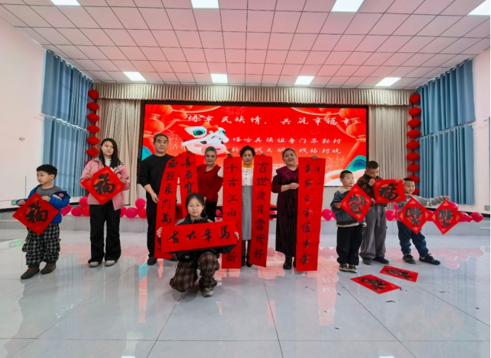 此次活动中,春联送福环节成为最受村民喜爱的亮点。县教科局精心组织系统内优秀书法爱好者来到现场,铺红纸、研浓墨、挥毫笔,一气呵成,一副副笔力遒劲、饱含祝福的春联,一个个寓意吉祥、笔墨饱满的“福”字跃然纸上。村民们有序排队、争相领取,手里捧着红彤彤的春联,脸上洋溢着幸福的笑容,现场既有墨香萦绕,又有暖意融融、笑声不断。这一举措不仅传承中华优秀传统文化,让年味更有文化底蕴,更以文化为纽带,拉近了后盾单位与村民之间的距离。