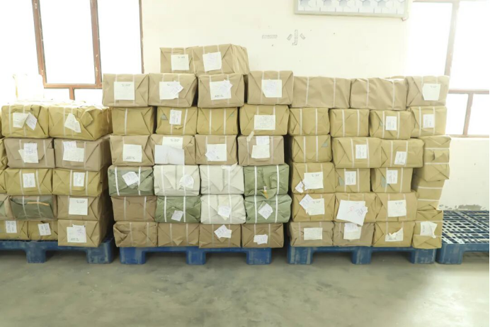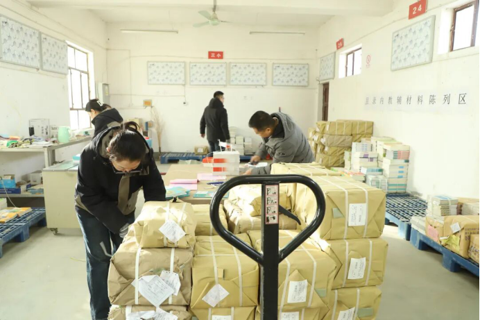 2月26日,记者在巴州新华书店有限责任公司和硕县分公司教材库房看到,各类教材和教辅资料按科目、年级、学校整齐码放,工作人员正仔细核对、分发、打包、装车,并进行配送,现场一片忙碌。